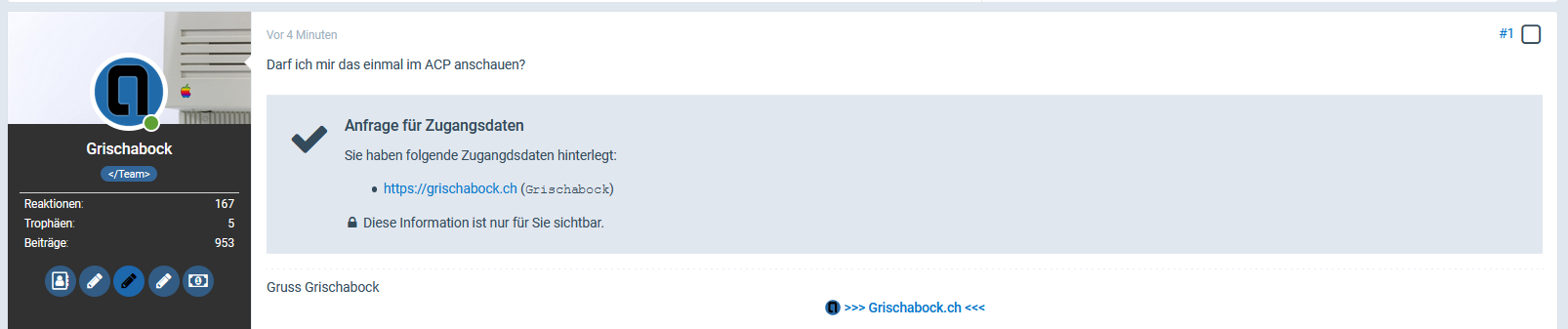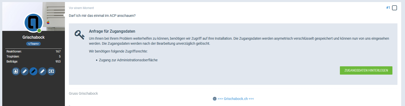 Unser neues System löst genau dieses Problem und bietet einen sicheren Umgang mit Zugangsdaten. Sollten wir Zugang zu einem Kundensystem benötigen gibt es eine explizite Anfrage im Beitrag. Dieser ist auf die Zugangsdaten beschränkt, welche für die Behebung des Problems notwendig ist.