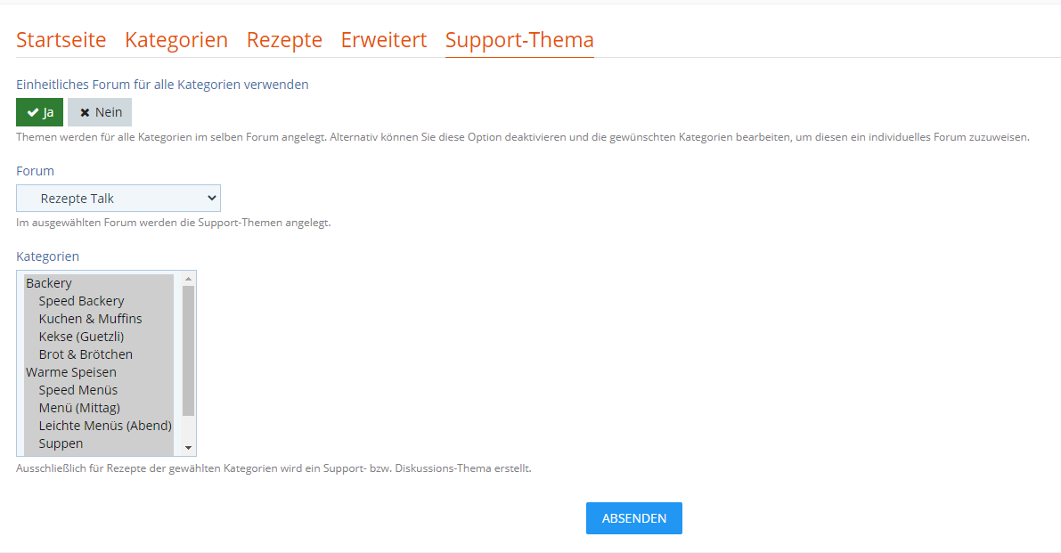 Verstehe ich nicht ganze, du machst die Support Threads ja Global unter Konfiguration Optionen Rezept Datenbank Support-Thema Wenn du also das Paket der Support Themen installiert hast, dann musst du auch ein Forum auswählen. Willst du keine Support Themen dann deinstalliere die Erweiterung der Support Themen einfach.
