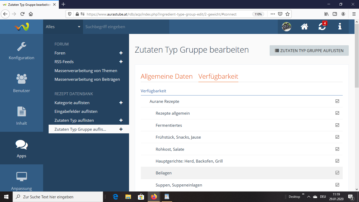 Ich will die Typen Gruppen im ACP nicht konfigurieren, ich will, dass sie nicht nur in einer und zwar in der ersten Unterkategorie sind, wo ich auch zwei Rezepte eingestellt habe, es geht nur da, da können auch alle Registrierten User Rezepte einstellen, das konnte man so einstellen.