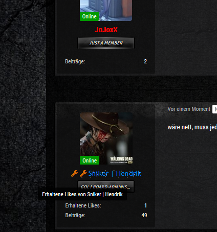 Zudem nutzt du das Plugin "Benutzer Online- Markierung" das im ACP Konfiguration Nachrichten Seitenleiste die Option „Benutzer online“-Darstellung für Benutzernamen verwenden bietet welche das Icon Dupliziert. Ich habe dir dies mal deaktiviert um den Fehler zu umgehen. Wenn du diese Option nutzen möchtest wende dich direkt an WBB-Elite um den Fehler zu melden wenn es einer ist. Leider nutze ich das Plugin nicht und kann dir nicht sagen was das Plugin alles macht.