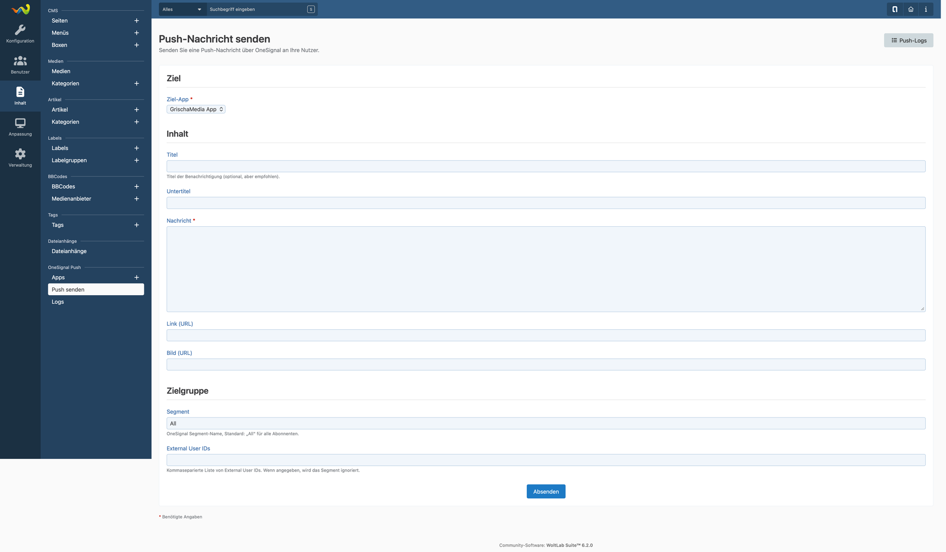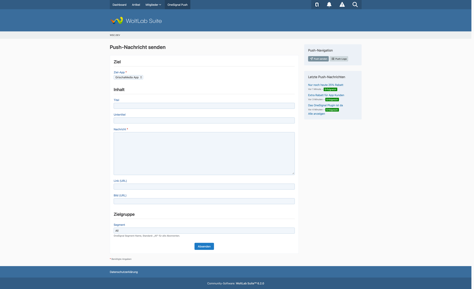 Push-Nachrichten sendest du bequem über ein Formular – wahlweise im ACP oder über eine eigene Frontend-Seite. Du kannst Titel, Untertitel, Nachricht, Link, Bild, Ziel-Segment und External User IDs angeben. Im Frontend sorgt ein Rate Limiting dafür, dass maximal 10 Nachrichten pro Stunde gesendet werden können.