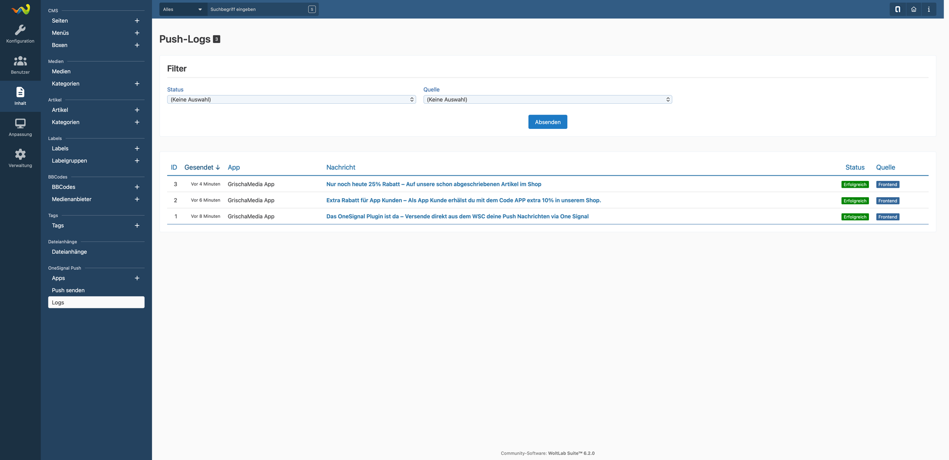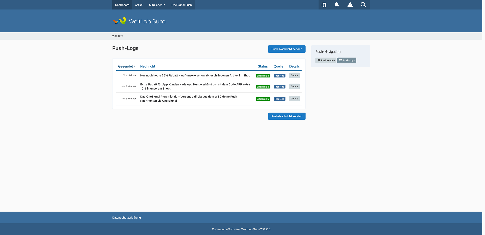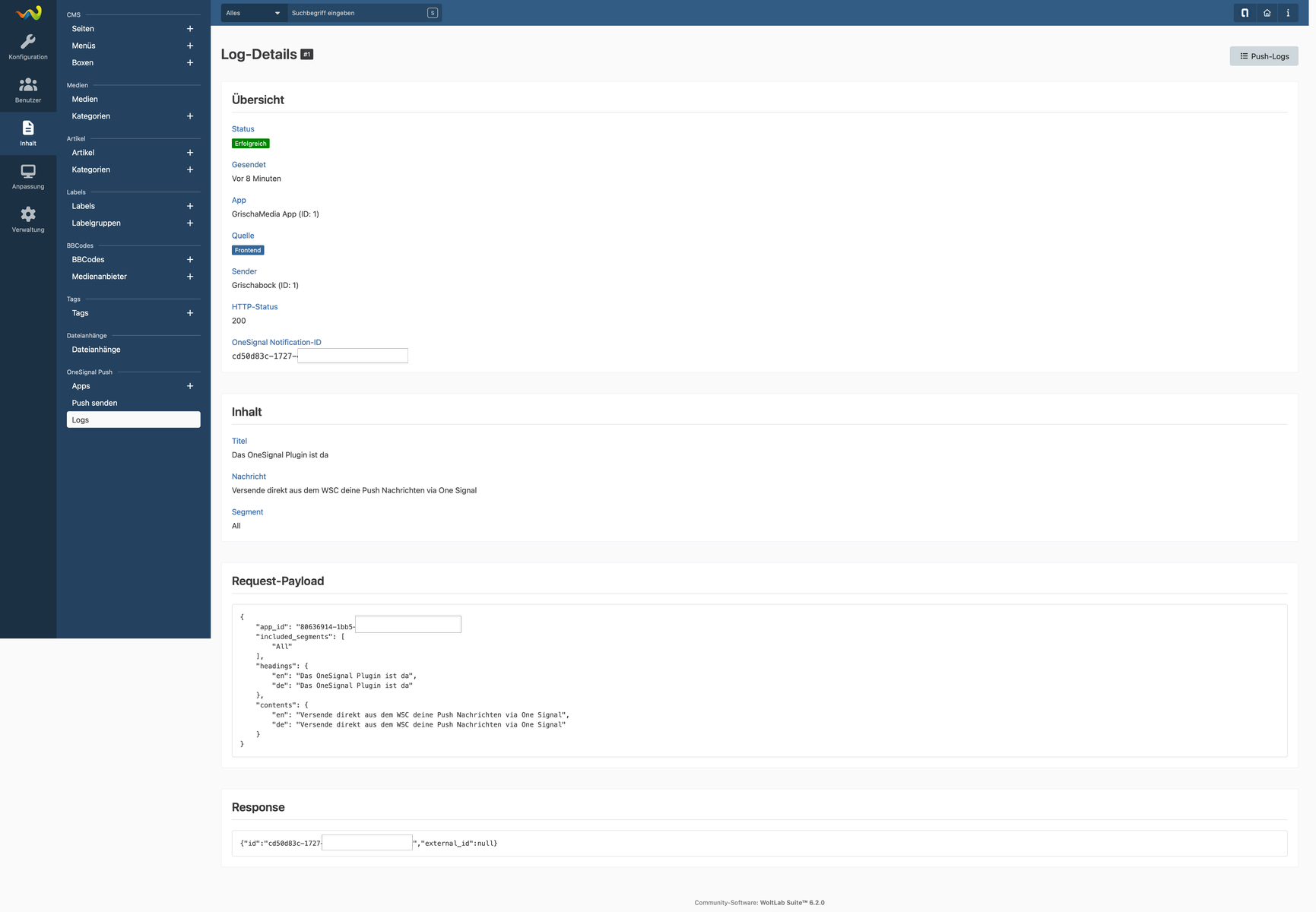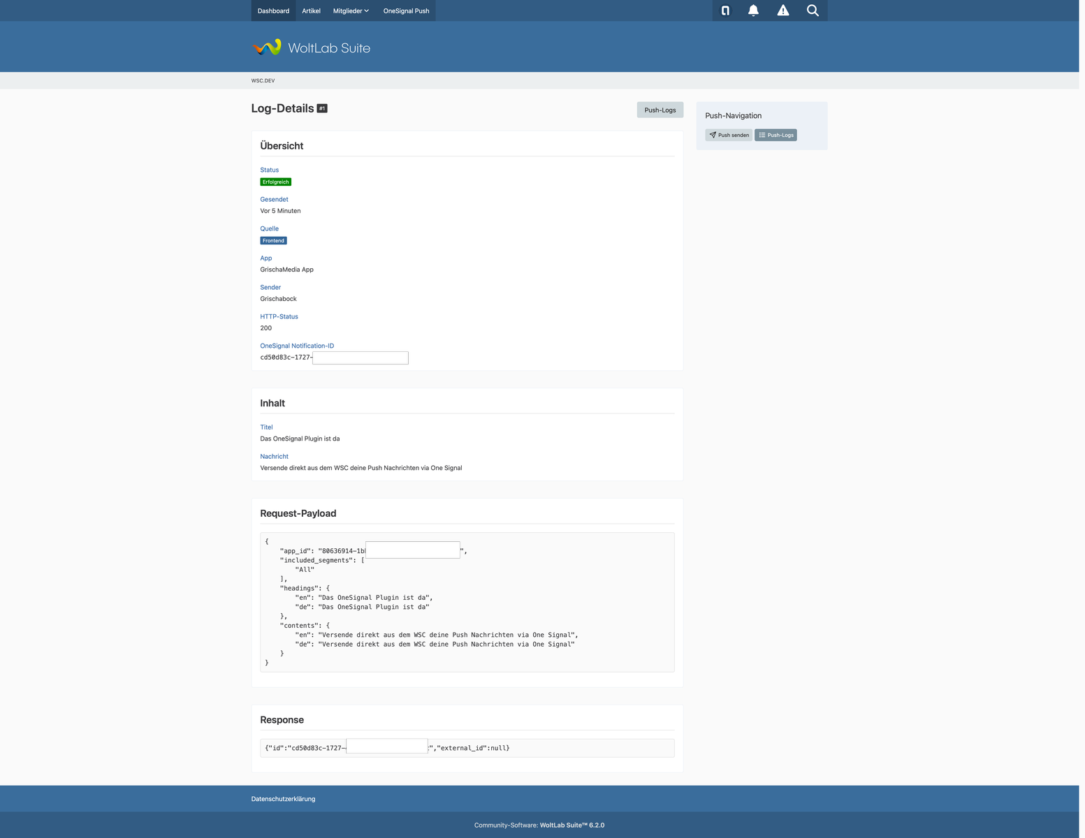 Jeder Versand wird automatisch protokolliert – mit Status, Zeitpunkt, Quelle, HTTP-Status, OneSignal Notification-ID, Request und Response. Die Logs kannst du sowohl im ACP als auch im Frontend einsehen, inklusive einer Detailansicht pro Eintrag.