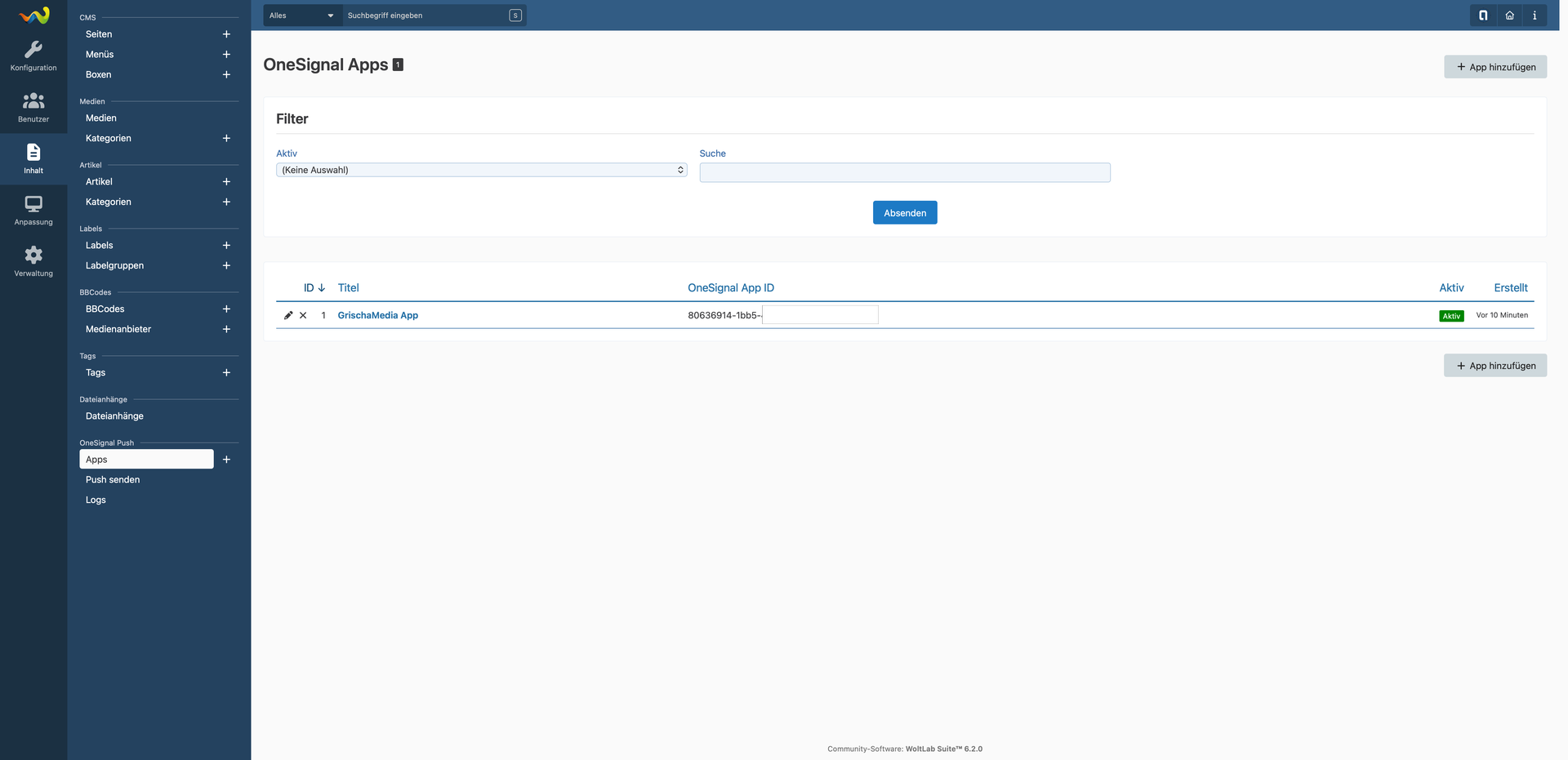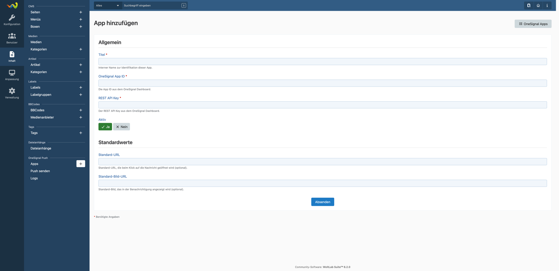 Verwalte beliebig viele OneSignal Apps direkt im ACP, zum Beispiel für verschiedene Projekte oder Plattformen. Jede App hat eigene Zugangsdaten, eine Standard-URL und ein Standard-Bild. Deine REST API Keys werden verschlüsselt in der Datenbank gespeichert und nie im Klartext angezeigt.