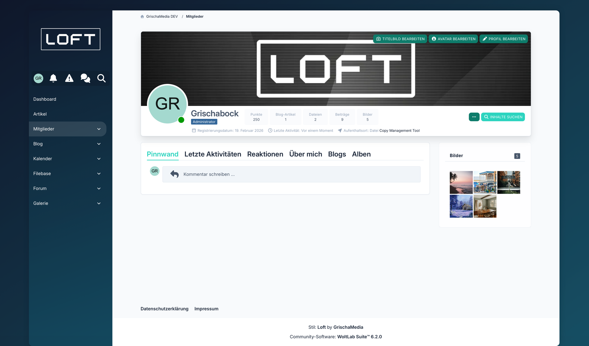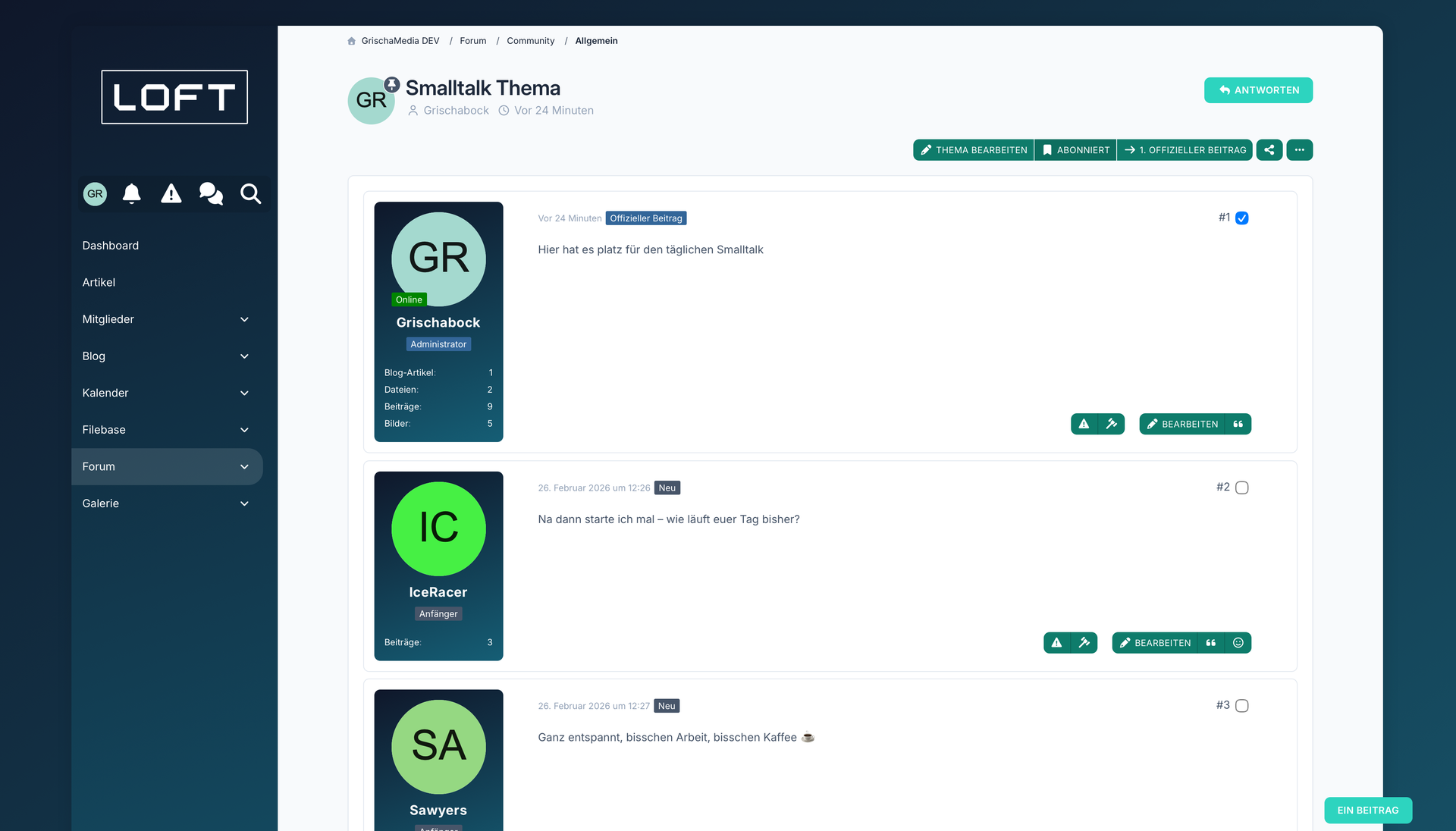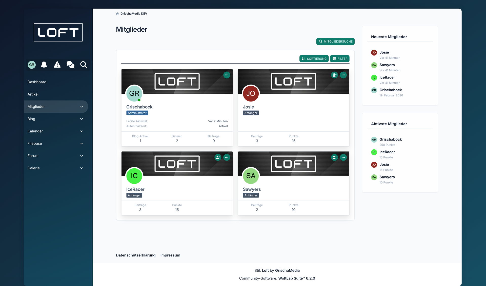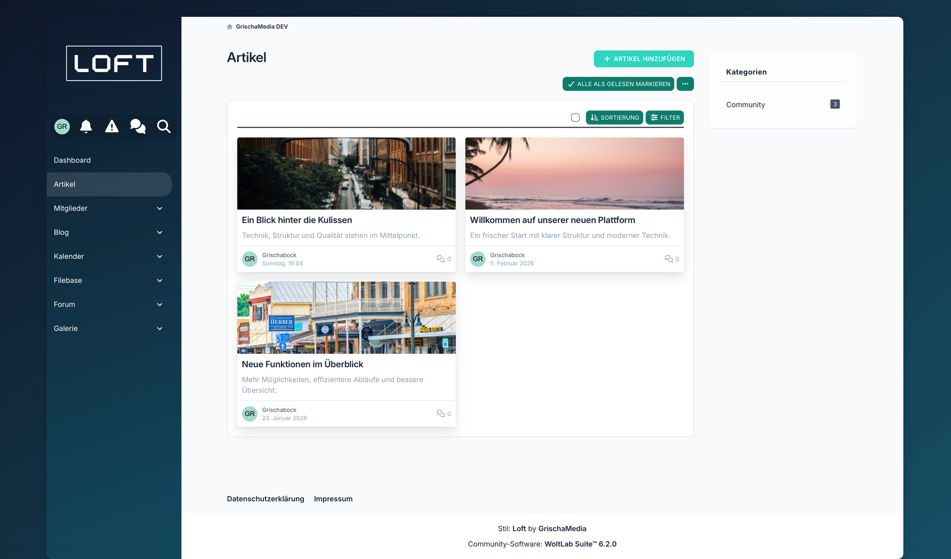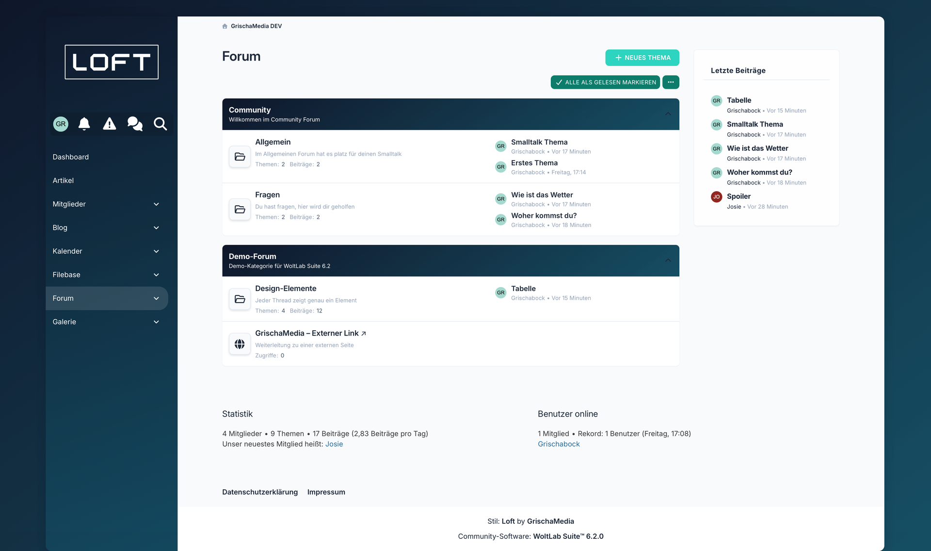 Mit LOFT erhält deine WoltLab Suite 6.2 ein zeitgemässes, reduziertes und zugleich markantes Erscheinungsbild. Der Stil kombiniert eine elegante, dunkle Sidebar mit einem klaren, hellen Content-Bereich und sorgt so für eine optimale visuelle Führung.