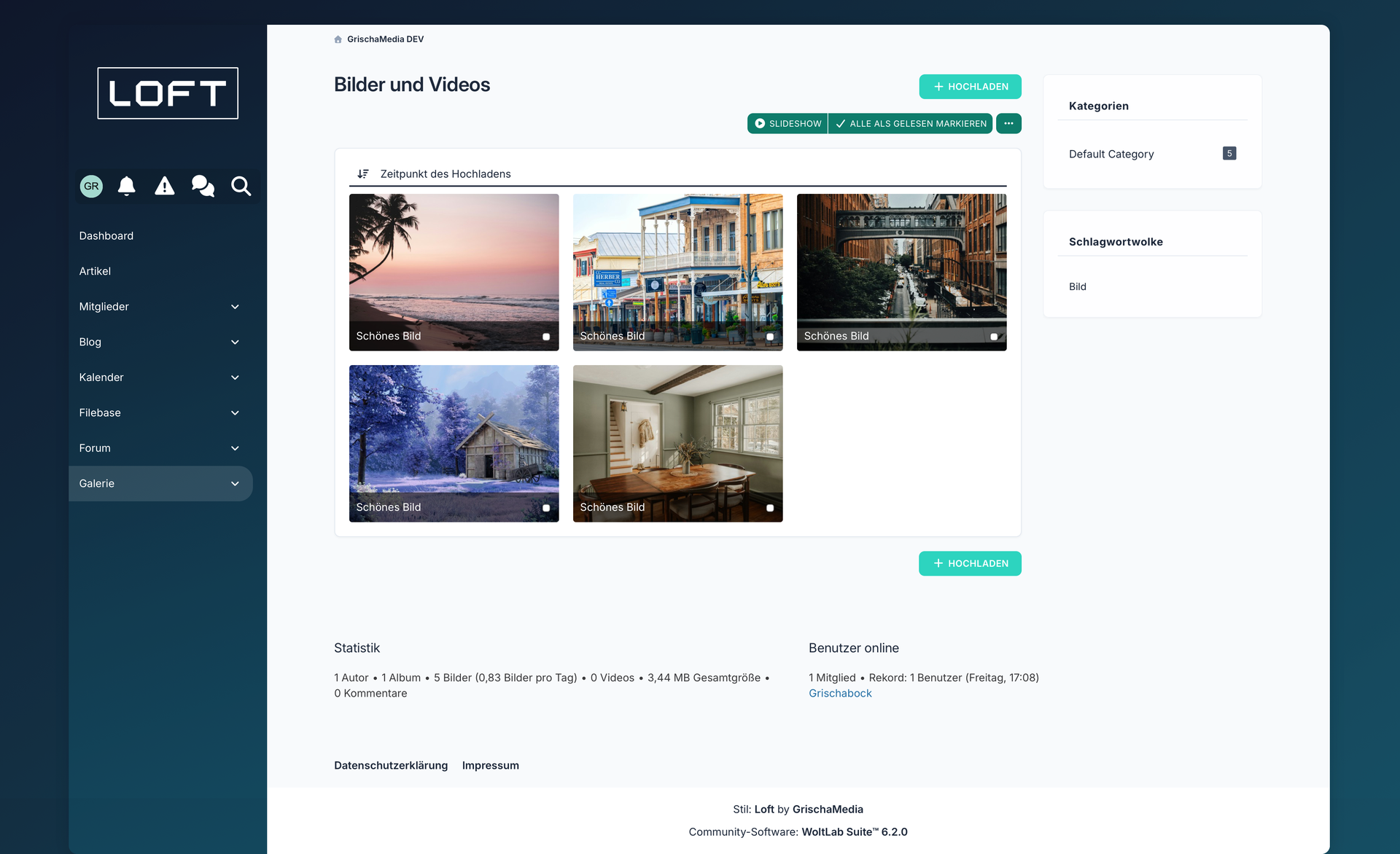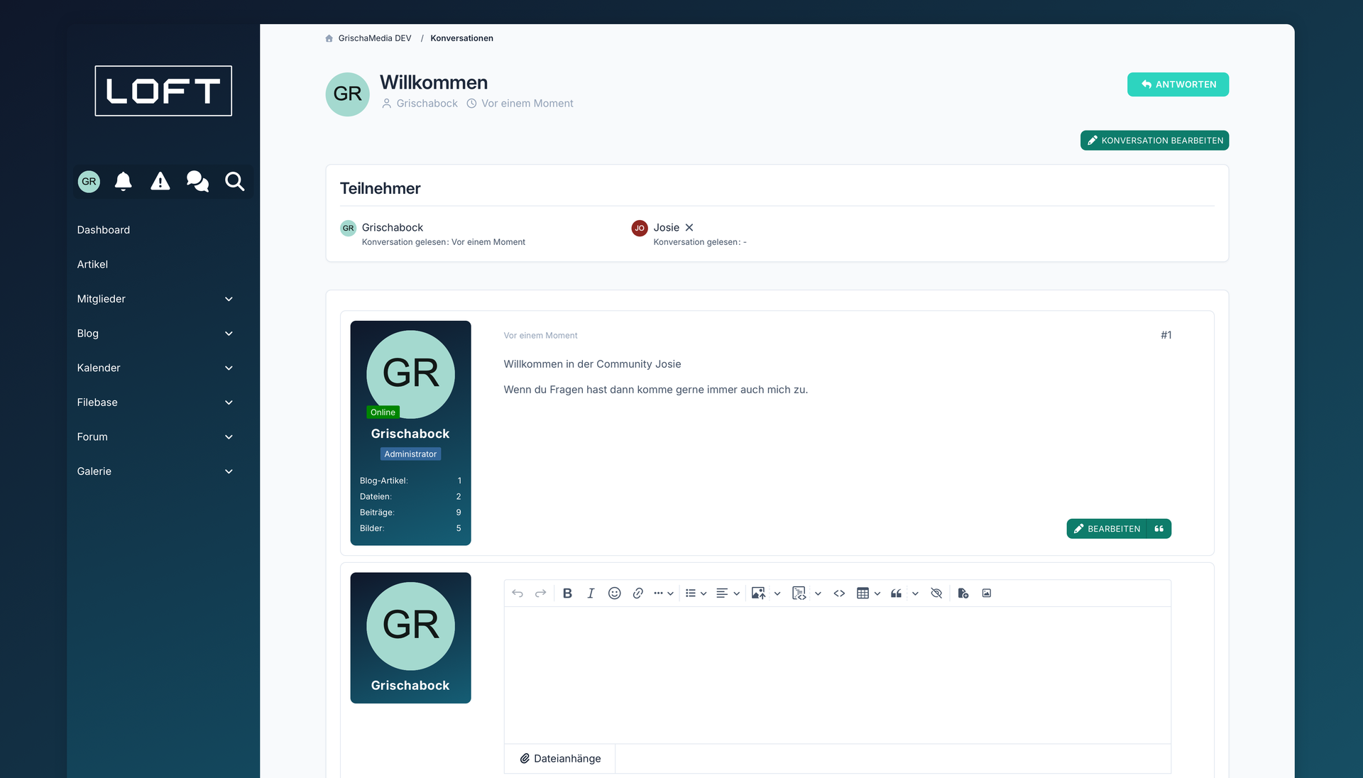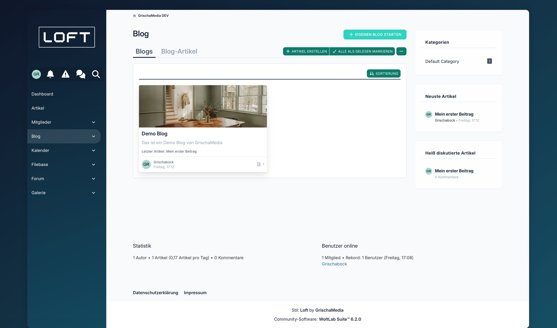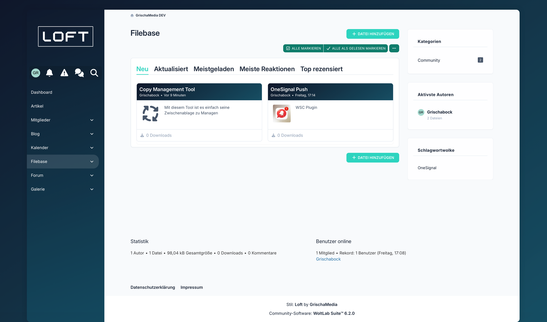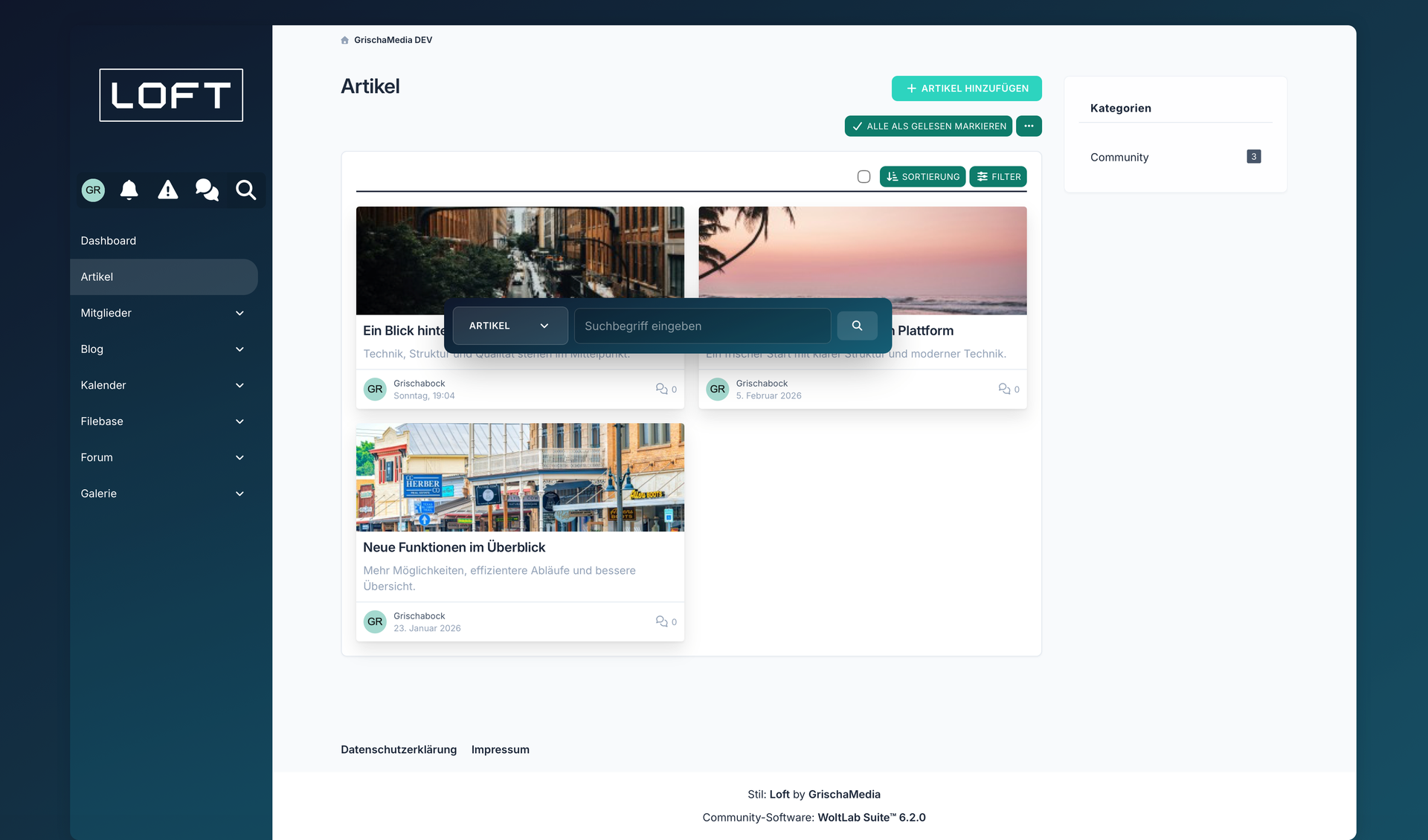 Mit LOFT erhält deine WoltLab Suite 6.2 ein zeitgemässes, reduziertes und zugleich markantes Erscheinungsbild. Der Stil kombiniert eine elegante, dunkle Sidebar mit einem klaren, hellen Content-Bereich und sorgt so für eine optimale visuelle Führung.
